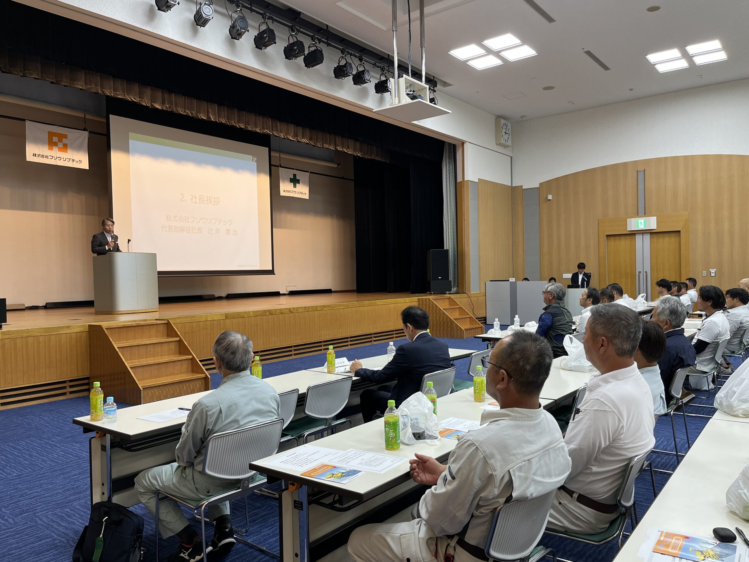 開会にあたっては、フソウリブテック安全協力会建設部会の会長よりご挨拶をいただき、続いて、弊社代表取締役社長の辻井より、安全や品質に関する今後の取り組みについて説明させていただきました。