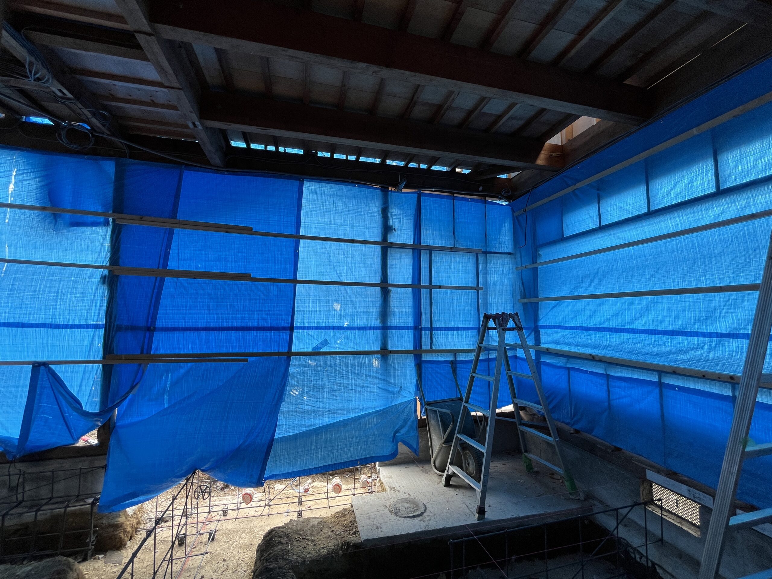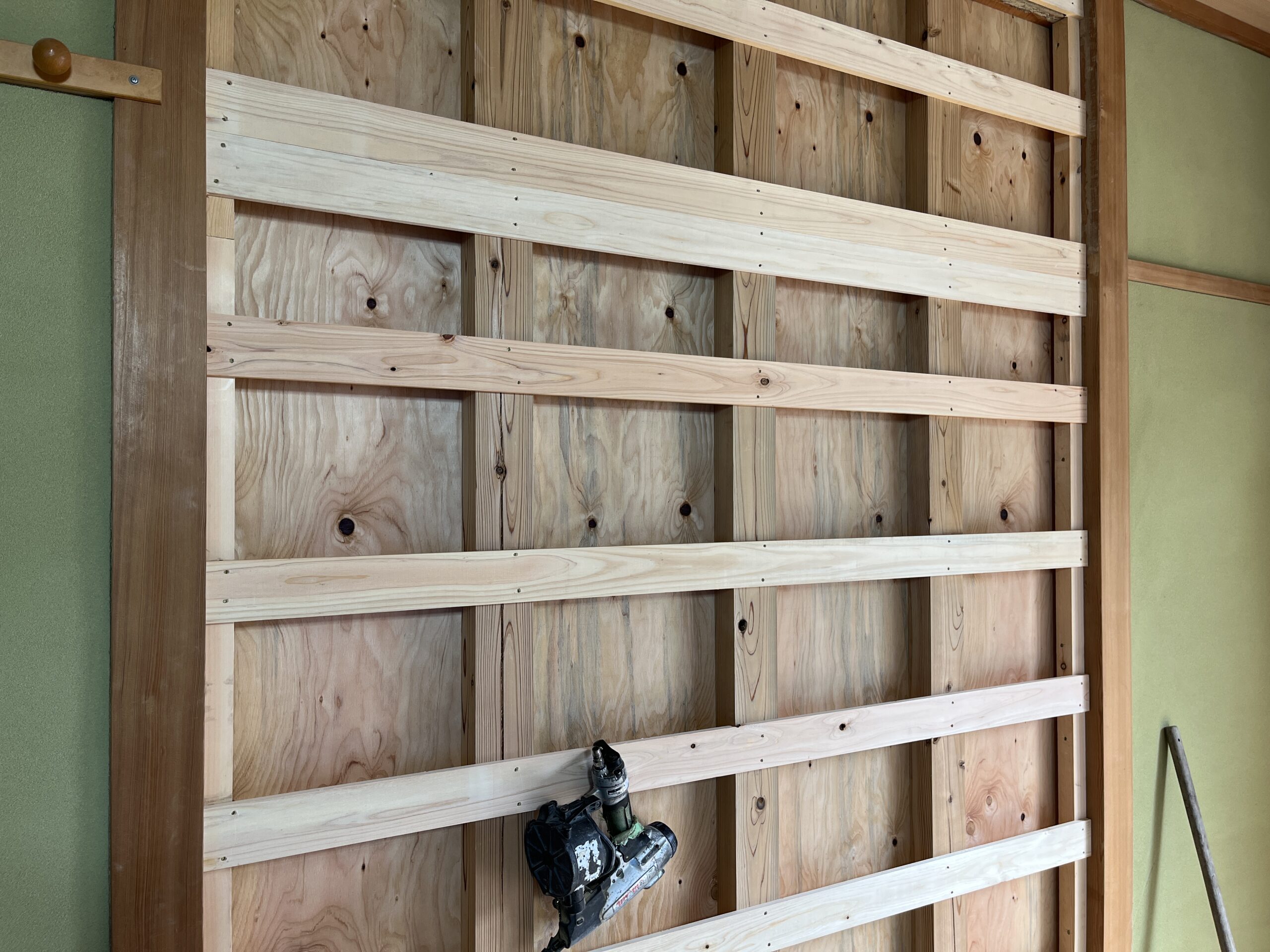 また、既存の柱には、長い年月を経る中で生じた僅かな歪みが見られます。そこに新しい壁をまっすぐに立ち上げるため、下地を丁寧に調整していました。こうしたミリ単位の細かな手仕事もリノベーションにはとても重要です。