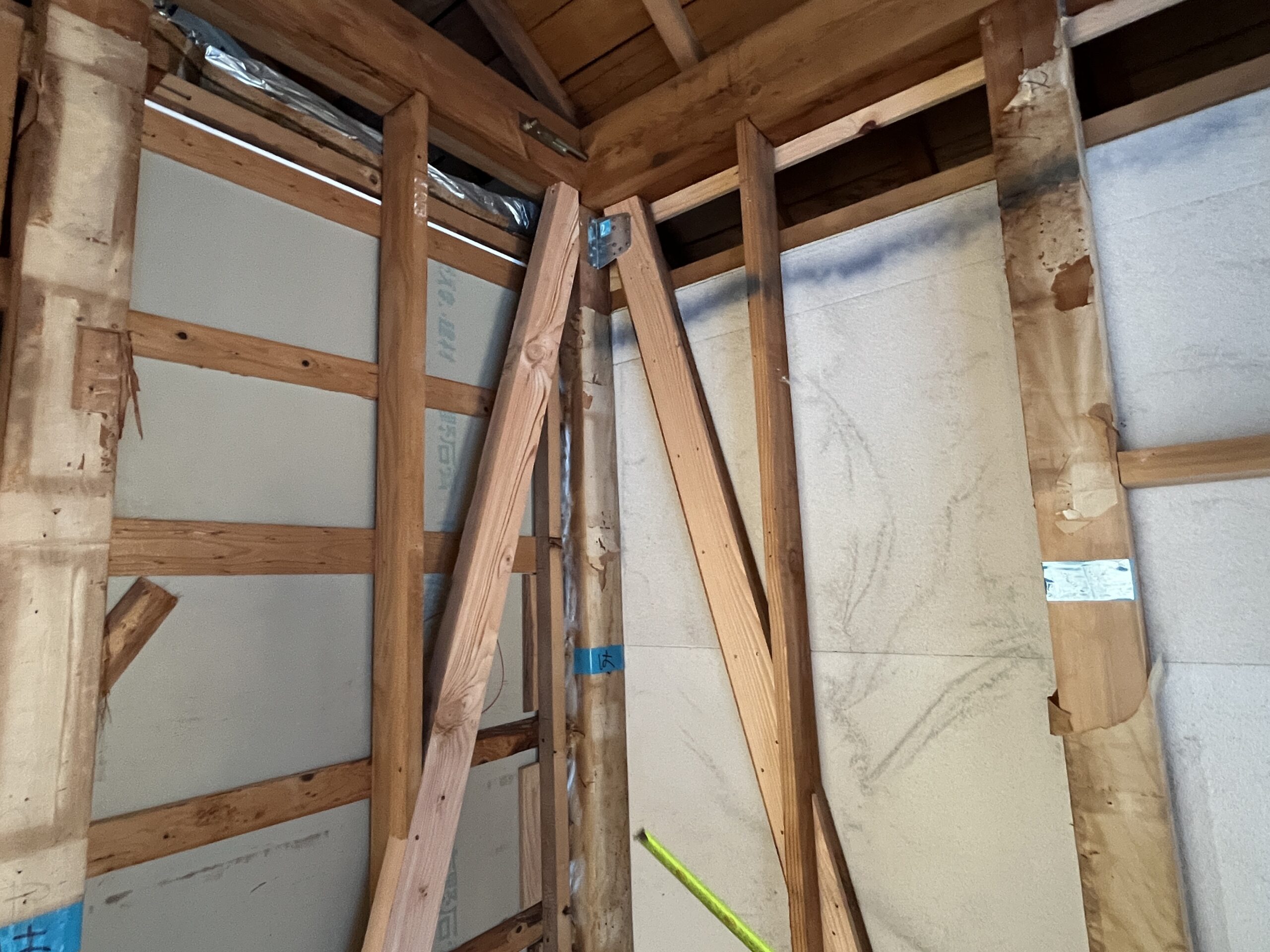 図面に従って新しい筋交いを入れ、新築と同じ基準の金物でがっちりと固定しています。