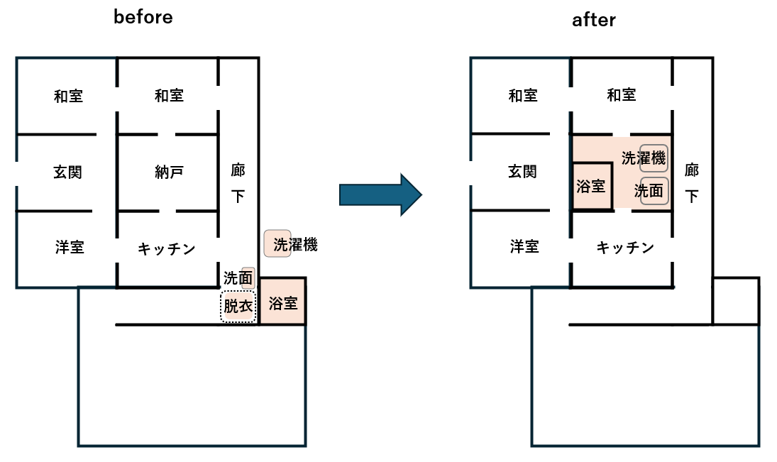 納戸がお風呂に大変身!動線を見直すと暮らしはもっと快適になります。