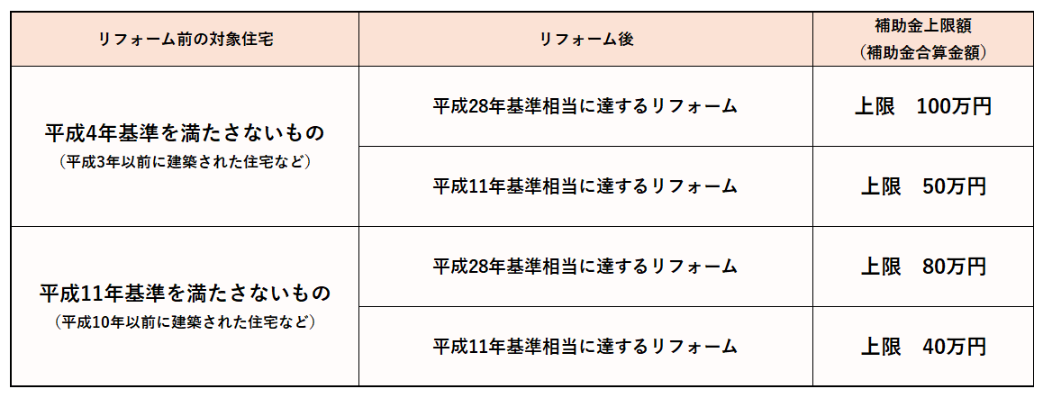 補助金の上限額は、既存住宅の建てられた時期と、どの基準までリフォームで省エネ性能を高めるかで変わってきます!