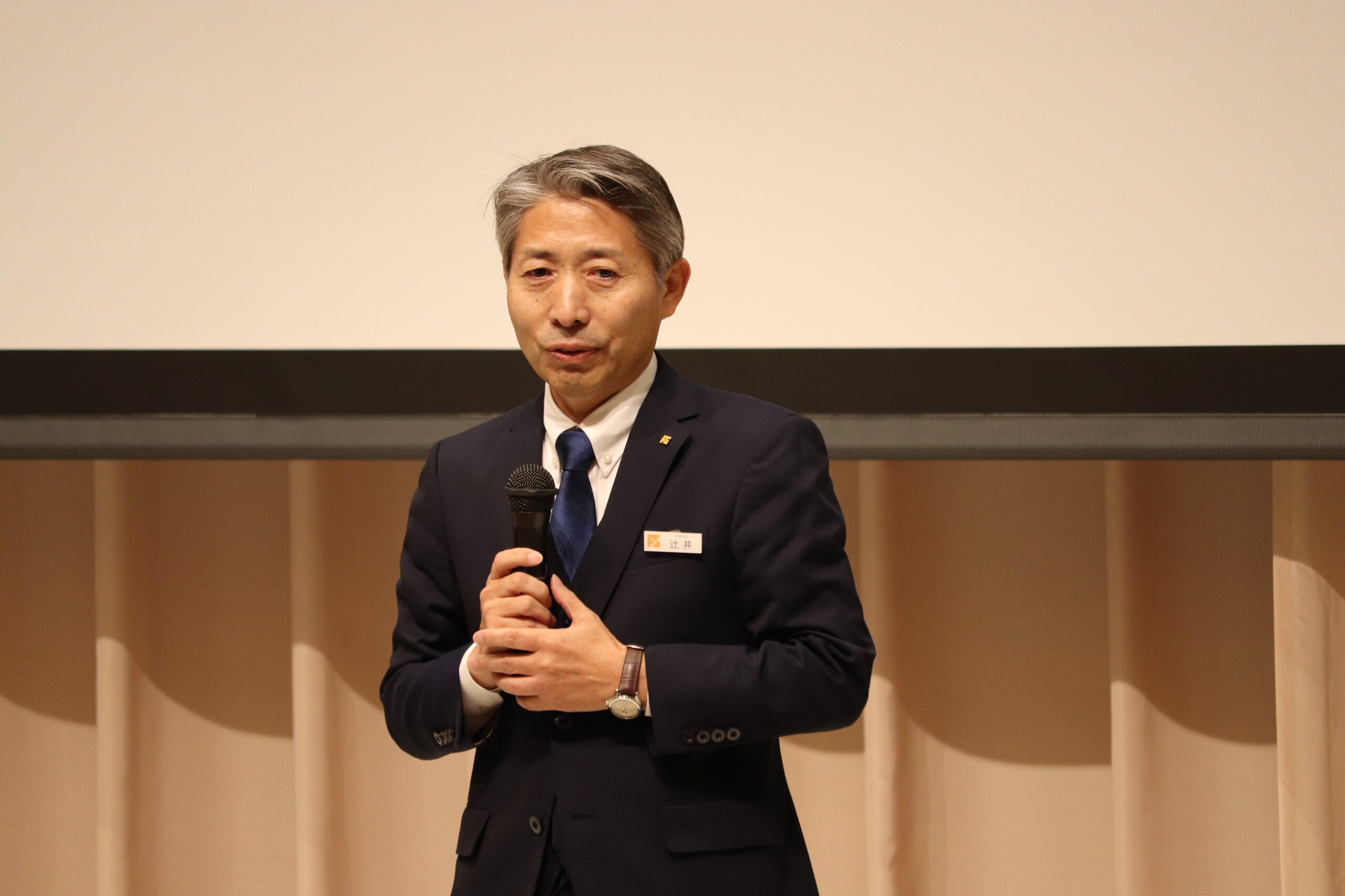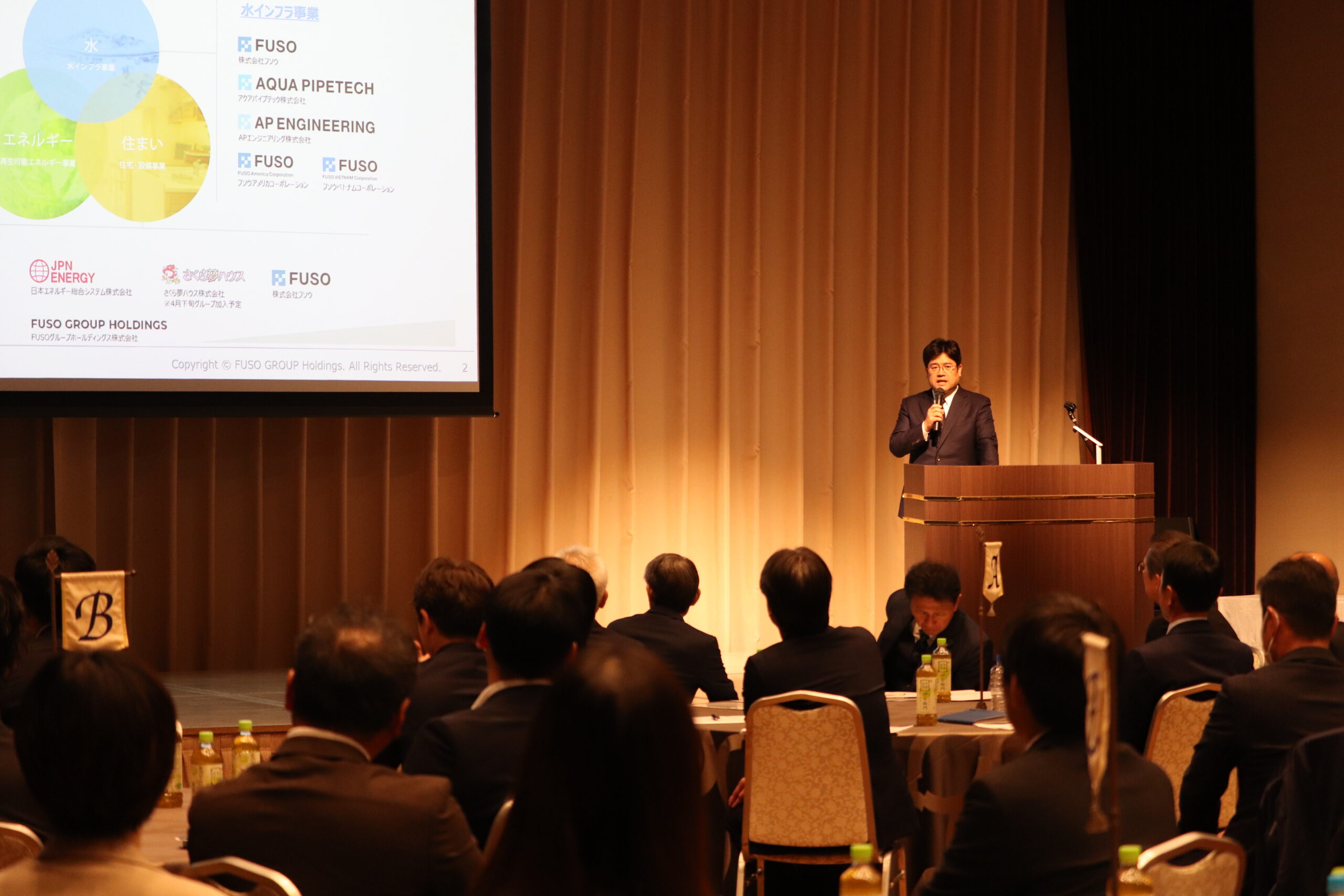 辻井社長より開会の挨拶の後、FUSOグループホールディングスの角社長より、グループ全体の取り組みや今後のビジョンについて共有がありました。