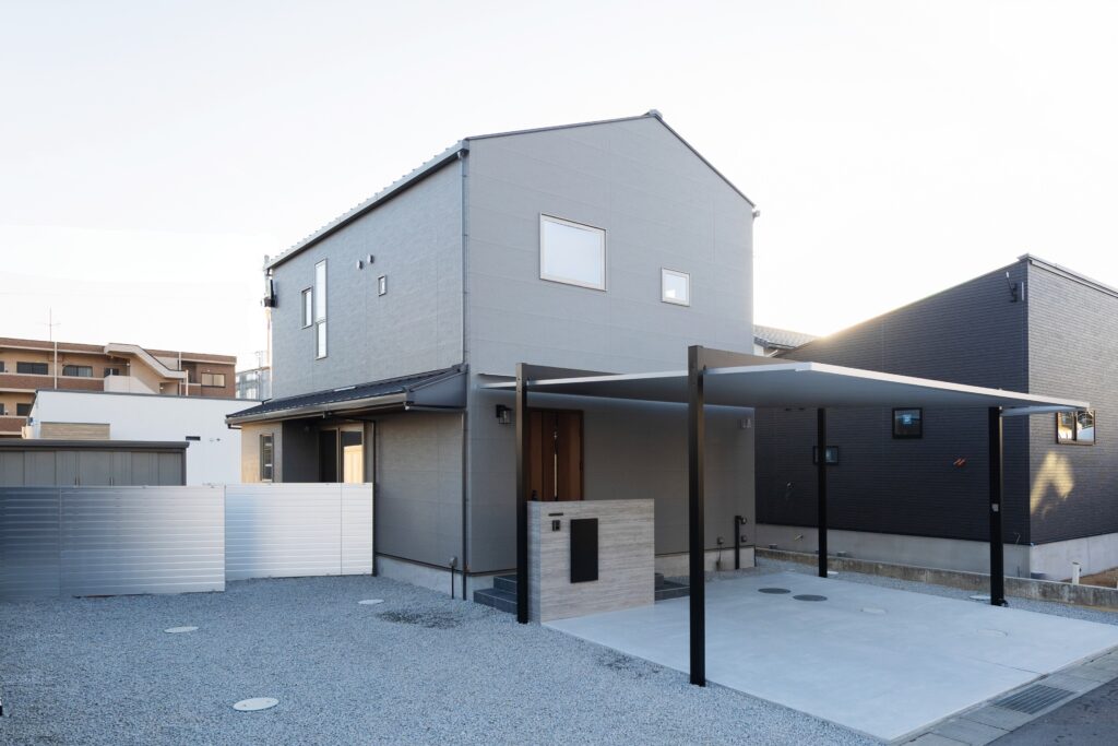青空に映えるモダンな白い外観が印象的なS様邸。「明るく、広く、風通しの良い空間でゆったりと過ごしたい」という思いから家づくりをスタートしました。みんなが集まる広々としたLDKは天井の高低差で生活空間に変化をつけます。リビングは和室やダイニングより天井を高くして開放的に、続く書斎は逆に天井を下げ、格子で空間を分けることによって落ち着いてこもれる空間に。階段下を利用した造作の本棚でたくさんの本もしっかり収納可能です。