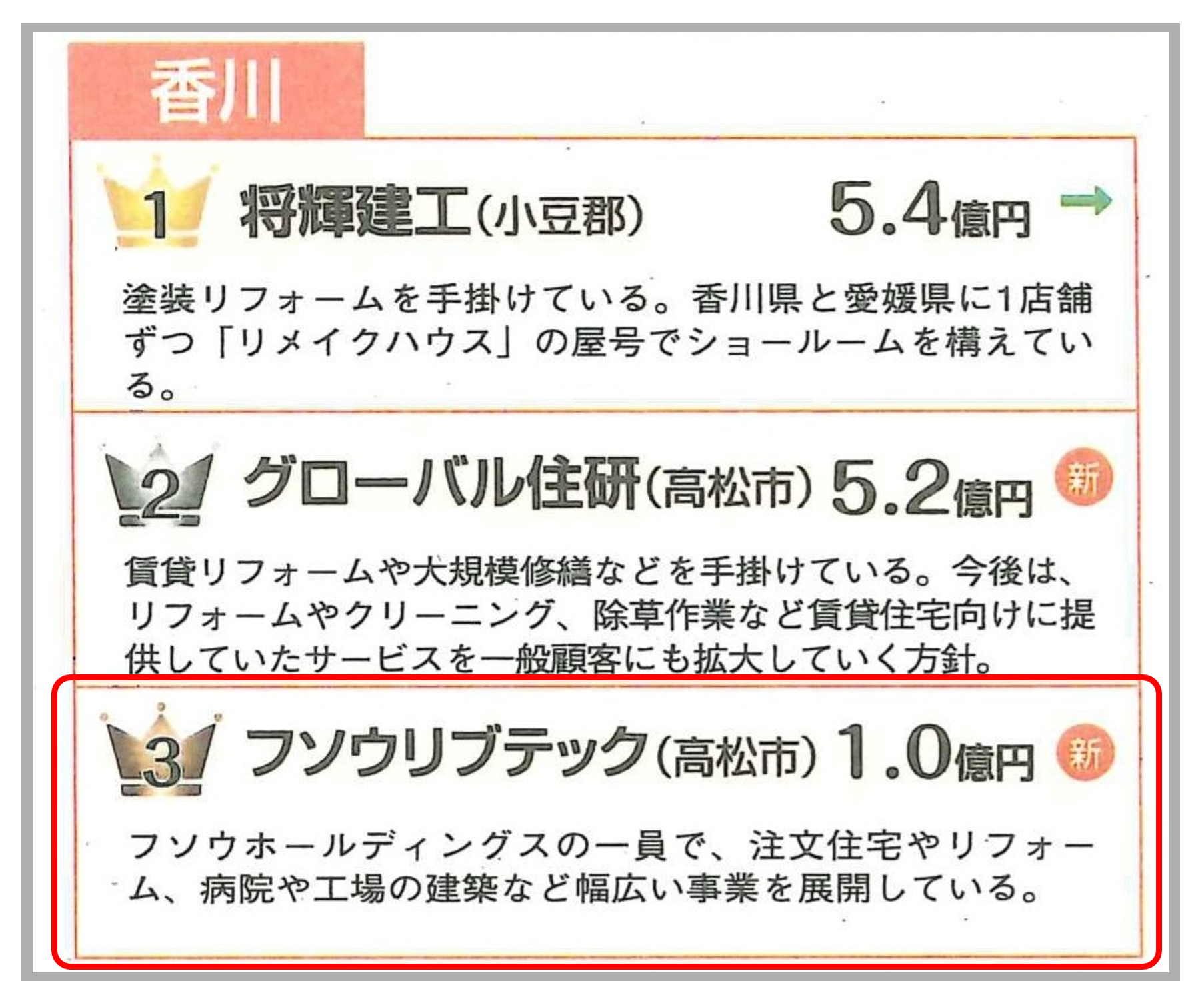 この「都道府県別リフォーム売上ランキング2025」において、当社は香川県で3位に選ばれました。