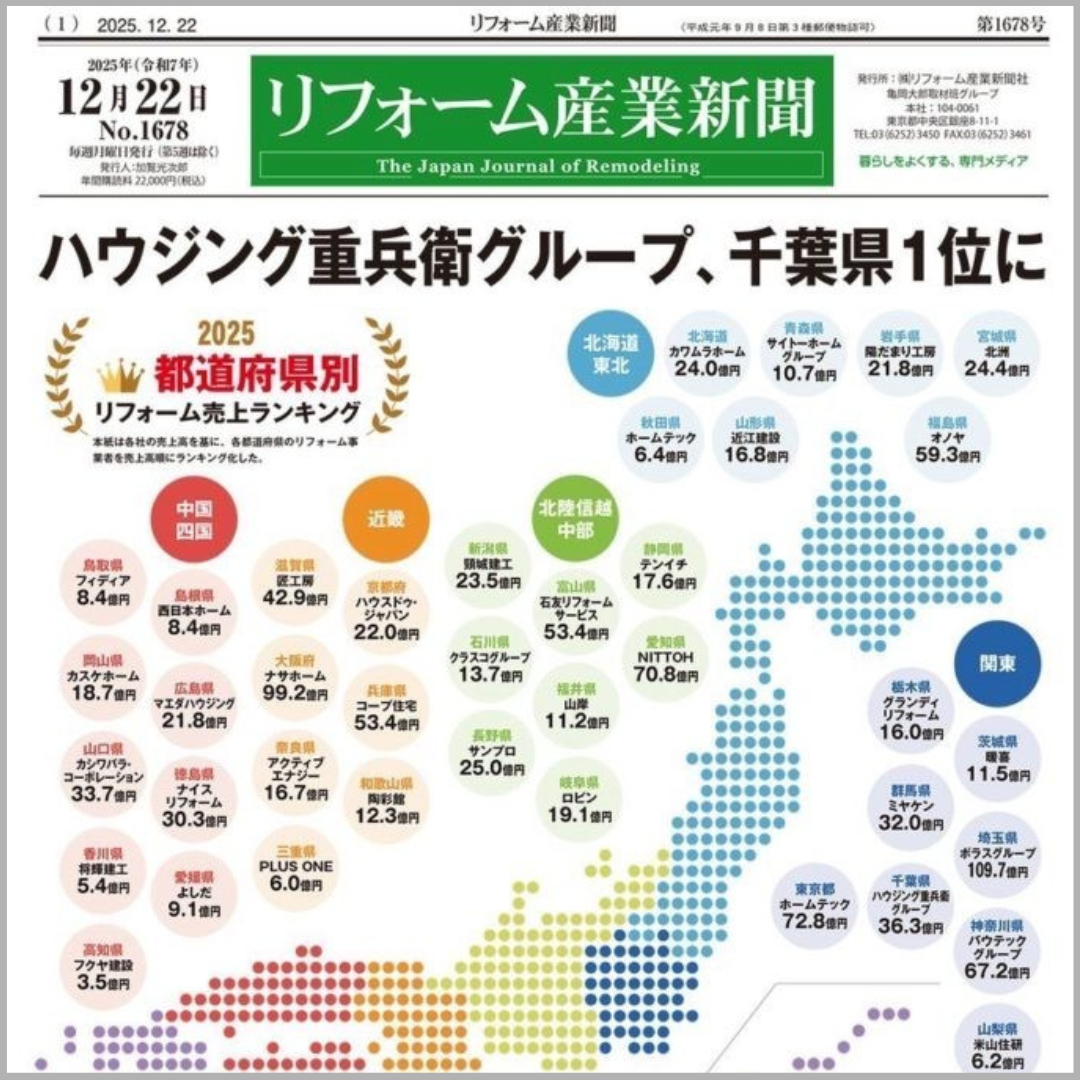 このたび、住宅リフォーム業界の動向を伝える専門紙「リフォーム産業新聞」(2025年12月22日号)において「都道府県別リフォーム売上ランキング2025」が発表されました。