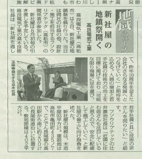 【メディア掲載】『建通新聞 香川版』 地域ニュース 新社屋の地鎮祭開く