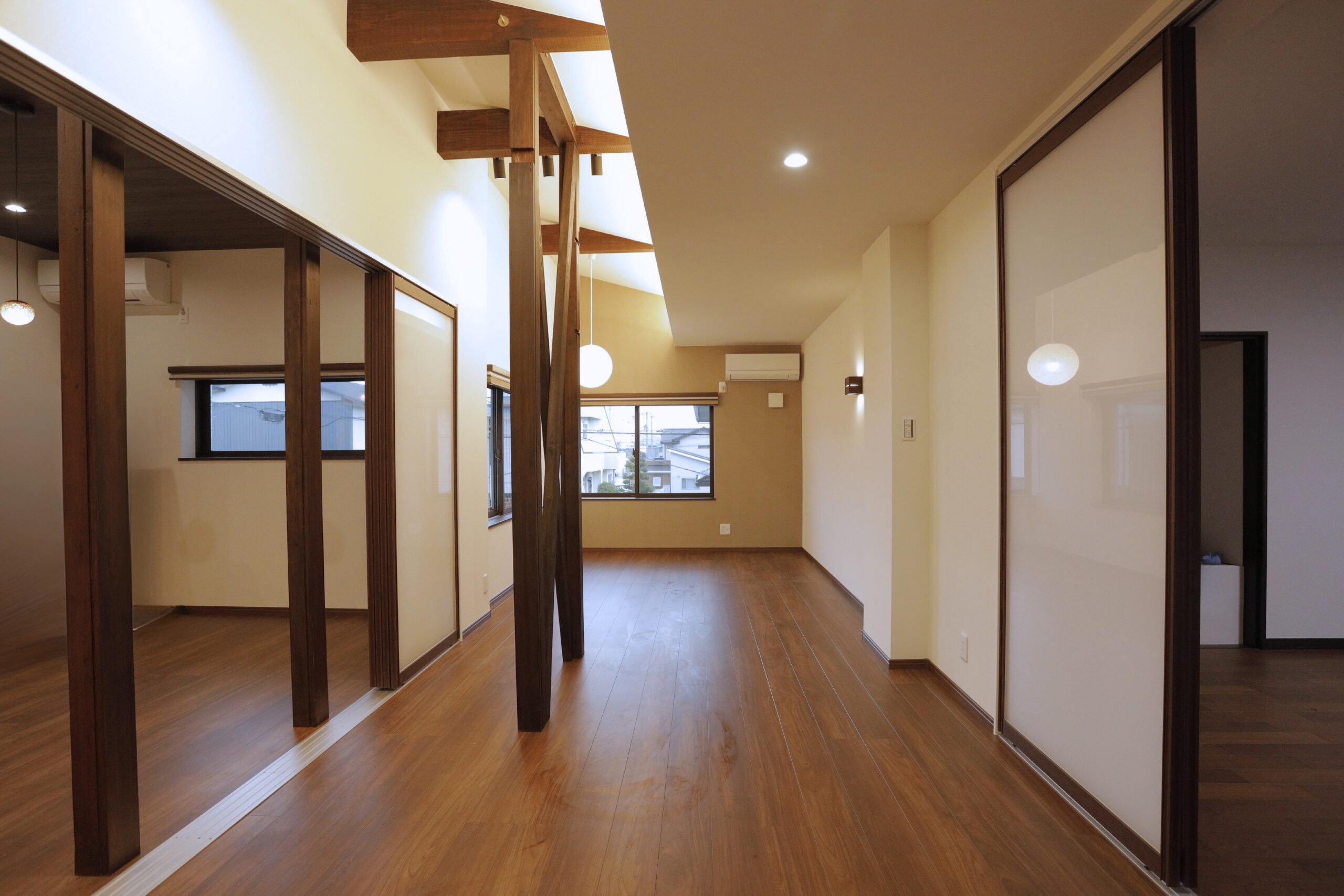引き戸を開けると3つの空間がつながり、広い空間として使えるようになった。乳白色のアクリル板を入れた建具は、閉めても柔らかな光を感じることが出来る。