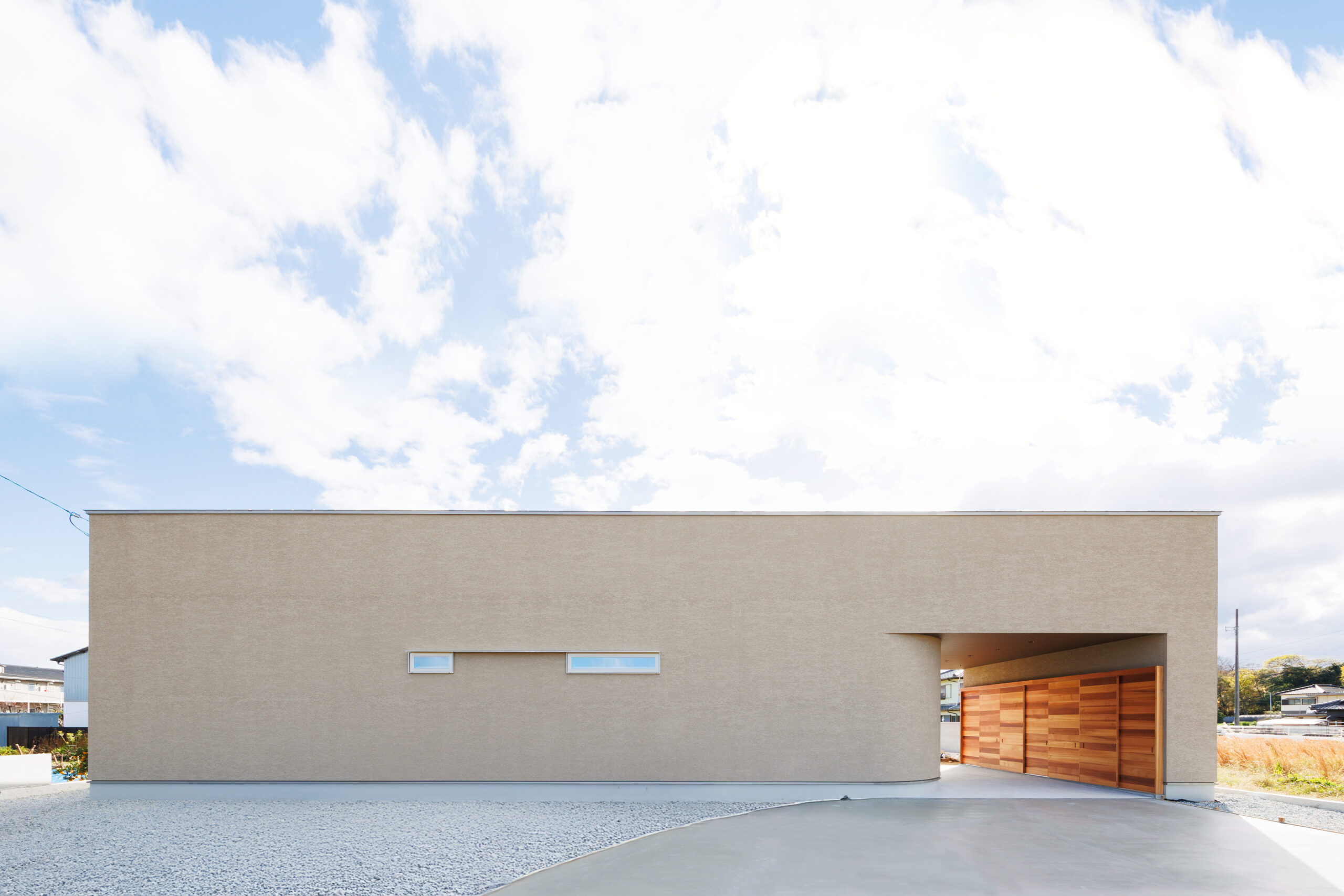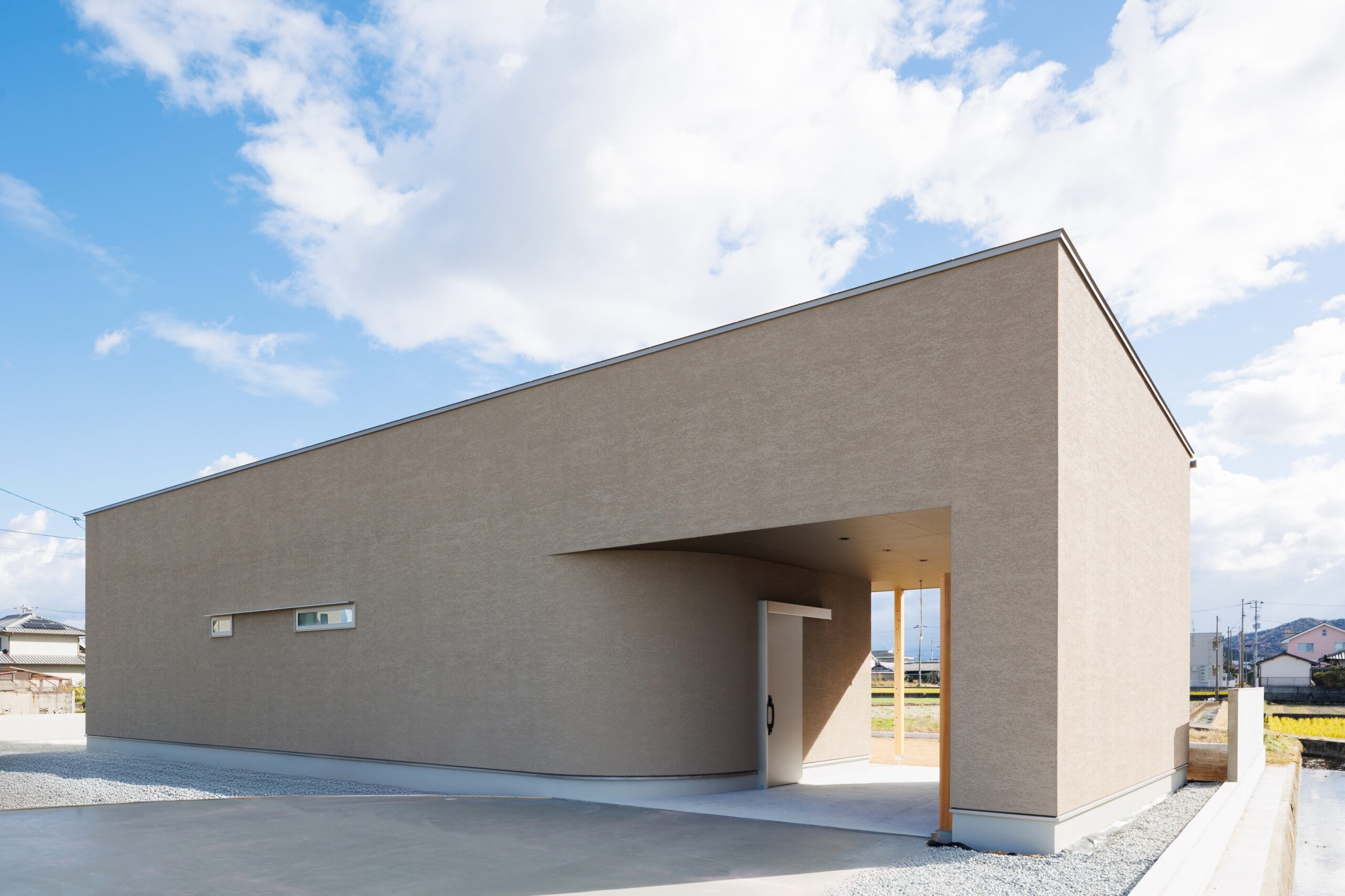 田中さん: そうですね。外観にも少しやわらかさを持たせたかったんです。田園風景の中で単調にならないような表情をつくりたかったですし、車の出し入れのしやすさもあります。いろんな意味が重なってあの形になりました。